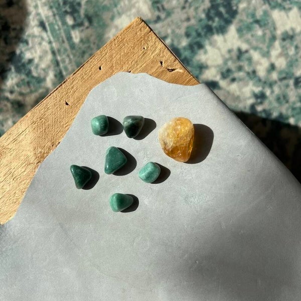 Inhoud: 6 Groene Aventurijn steentjes en een 1 Citrien (verhit) steentje. Exclusief het starterset met 6 bergkristal punten en bord, klik om deze te bestellen.