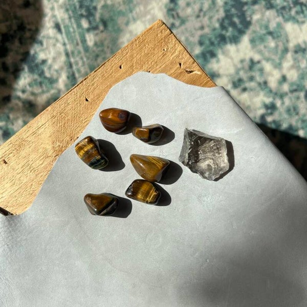 Inhoud: 6 Tijgeroog steentjes en een 1 ruwe Rookkwarts. Exclusief het starterset met 6 Bergkristal punten en bord, klik om deze te bestellen.